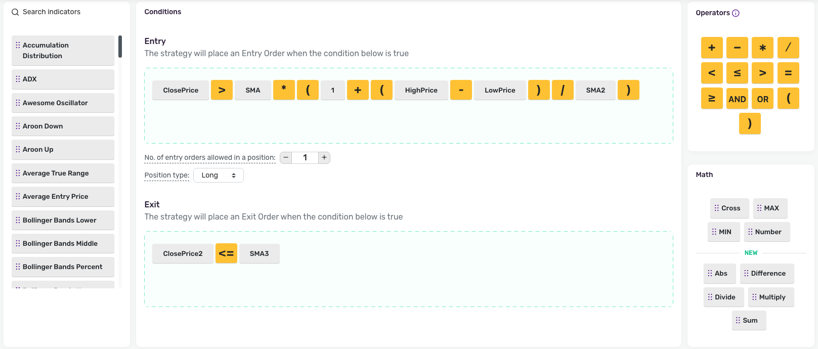Now, in order to do this with Vestinda Strategy builder you just need to drag the indicators, operators and parenthesis inside the Conditions area.